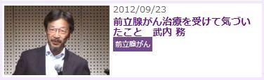Cancer Channel の「前立腺がん」に関するビデオ「前立腺がん治療を受けて気が付いた事・・・竹内 務さん」のお話の素晴らしさに感動いたしました。夫と二人で見せて頂きました。ありがとうございました、お礼申し上げます。
